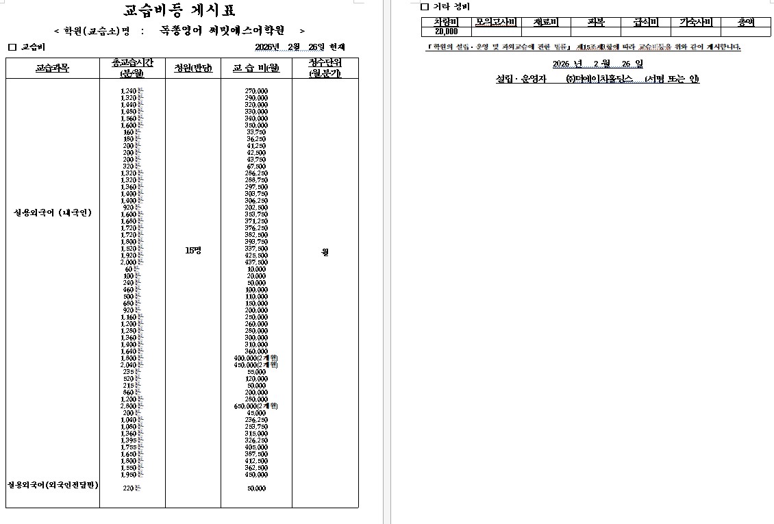 독쫑영어 써밋에스 교습비등 게시표
